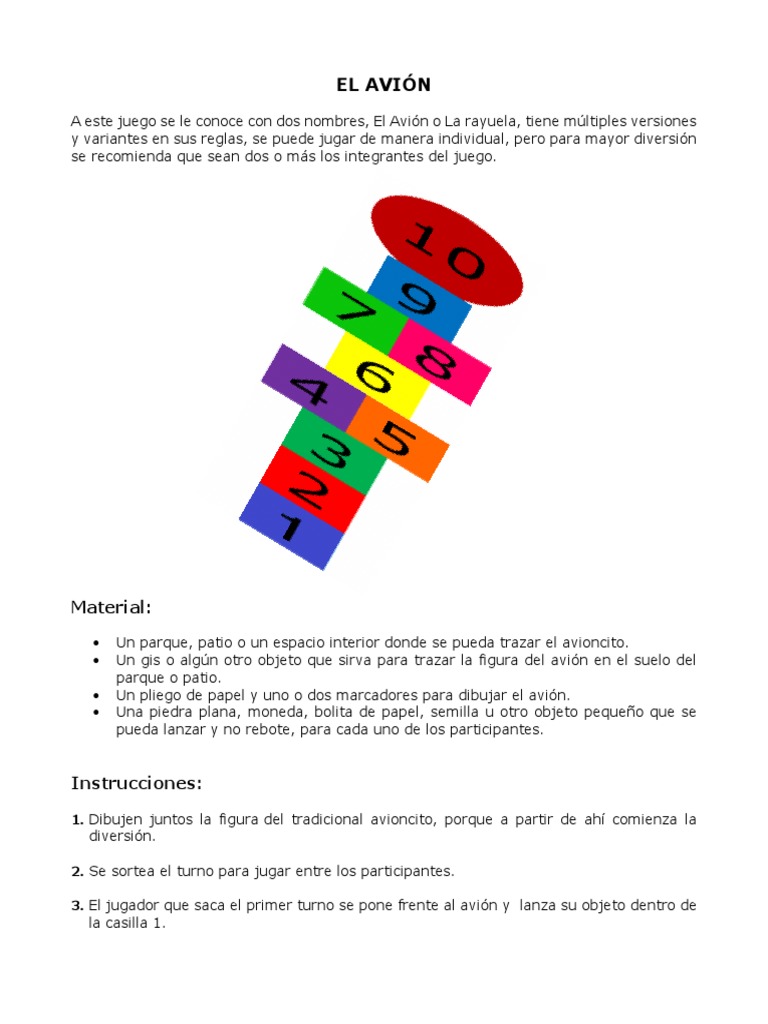 La rayuela es un juego tradicional conocido y jugado en la mayoría de países del mundo. Esta jugada te permite hacer dos cosas importantes en un solo movimiento: Depende del lugar donde se juegue, pueden variar ligeramente las reglas y el nombre del juego. Juliano salió de prisión y lo único que quiere es estar feliz con su familia. Dibujen la figura del tradicional avioncito.